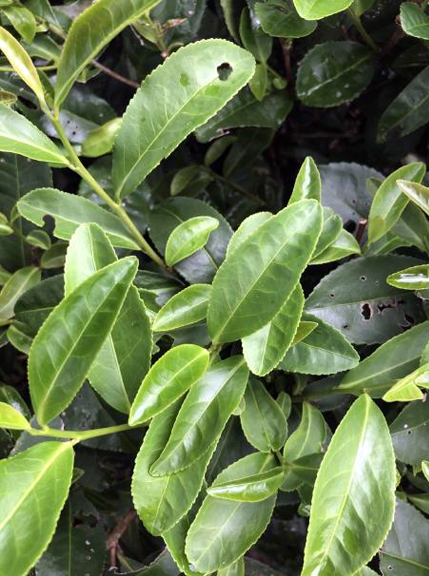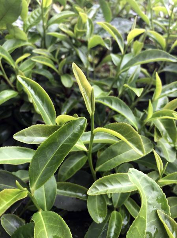 灌木型、小葉類、早生種。植株樹姿半開張,分枝密,葉姿上斜。葉片呈長橢圓形,葉尖較鈍,葉面微隆起,葉色黃綠,富光澤,葉肉較薄,葉質(zhì)柔軟,側(cè)脈明顯,鋸齒較粗、整齊,葉緣微波,芽葉纖細(xì),色黃綠,嫩葉內(nèi)折。